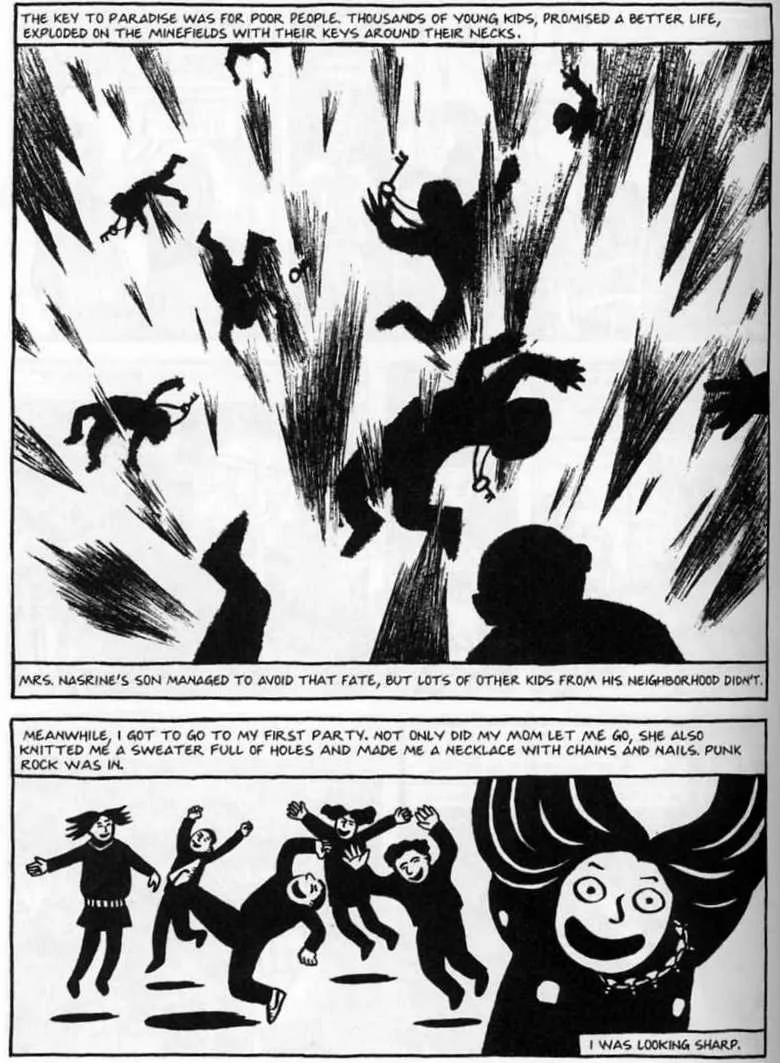 Wszystko to podane jest w formie prostej, nieutrudniającej odbioru. Prosta kreska jest jednak w odpowiednich miejscach wyrazista, a Satrapi nie boi się jej wzbogacać na różne sposoby. Pierwszy widoczny jest zwłaszcza na początku, gdyż na łamy komiksu często przedostają się wytwory wyobraźni protagonistki. Mimo wspomnianej prostoty i czarno-białej palety te kreacje efektywnie uzupełniają narrację. Ponadto rysowniczka podkreśla niektóre kluczowe momenty odejściem od standardowego układu ramek, a czasem i dokłada do tego zabiegi, które z braku lepszego słowa (i wiedzy autora niniejszego wpisu) można określić metaforycznymi. Widać to na przykład na stronie kontrastującej horror wojny, na którą skuszonych religijnymi obietnicami trafiało najwięcej mniej wyedukowanych mieszkańców biedniejszych dzielnic, z pierwszą prywatką głównej bohaterki. Pierwszy kadr jest większy (zajmuje 2⁄3 strony), ale postaci na nim są bezkształtne, pozbawione tożsamości… choć giną. Natomiast na drugim zobaczyć można osoby wyraziste i w dodatku uśmiechnięte.